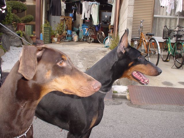 昨日の夕方。。。『ピンポォ~ン』(°o°?) 呼び鈴が鳴った!! 母がいそいそドアを開けると『久しぶり~~~♪(⌒O⌒)/』 コニー父とコニーが笑顔で立っていた(^~^)ヒヒ 母は急いで小悪魔ちゃんを連れ出した・・・後からカメラ片手にのび太も走る(-_-;)オイオイ 玄関先で、コニー父&母&のび太で雑談開始☆ 小悪魔ちゃんは『ガウ、ギャウ』コニーに意地悪するし・・・( ̄∞ ̄メ)アワワ コニーは、必死で《猫探し》に夢中だし・・・(* ̄m ̄)プッ 皆それぞれ、好き勝手に楽しいでいた(滝汗) コニー父は言わずと知れた。。。【ショ~・マニア】(゜-゜)ウンウン 何十年と、PDのド~ベルマンの“ショ~”だけに携わって来た!! 小悪魔ちゃんに対しても、厳しい指摘はズバズバ言う(;^~^;)ヒヒ いくら意見されても。。。母には『ぬかに釘~★』状態♪♪ 母は小悪魔ちゃんが《世界No.1》のワンコと思ってるだけに(←ワンコ飼いなら誰でもだぁ~ネ(≧m≦)ヒヒ コニー父にも遠慮なしで、母は好きな事を言う( ̄ー ̄)ニヤリ そういう雰囲気を察知したのか・・・コニー父も最近言いたい放題かも(ーー;)ジロ さて、今日のコニー父の失言集はというと(゜■゜)/ ① コニーの《ピカピカコ~ト》を眺めながら話していた時・・・ 母...『コニーは6歳やのに、綺麗なコ~トやなぁ~(☆▽☆)キラキラ』 コニー父...『そんな事ないで!もう年やから汚いやろぉ~』 母...『あ~きなんか2歳やのに、ハゲあるしボロボロやでぇ~~~(;◇;)』 コニー父...『そうやなぁ~。。。うんうん(゜-゜)』(°∞°;)何? 母...『コニー父!!!今“うん”言うたか????(≧◆≦)/オイッ』 コニー父...『ワッハハハハハ~~~~(≧▽≦)』 母...『・・・無言( ̄~ ̄;)冷汗』 ② 遊ぼうコニーに、小悪魔ちゃんが“ガウガウ”するのを見てた時・・・ 母...『あ~き!なんでこんな意地悪なんやろぉ~(-_-;)ハァ。。。最悪やん★』 コニー父...『ワッハハ!!飼い主に似たんやなぁ~(≧m≦)ヒヒ あ・ず・き(爆)』 母...『・・・年とったら、落ち着くかなぁ~(ーー;)ジィーーー』 コニー父...『うぅん?もっと意地悪になるんちゃう(* ̄m ̄)ククク』 母...『何それぇぇぇ~~~~~(≧∞≦)/』 コニー父...『人間だって年とったら意地悪になるやん?あずきは“意地悪婆さん”や!!(≧m≦)ブッ』 母...『・・・無言( ̄~ ̄;)滝汗』 なぁ~~~んて、会話が成り立つような感じでっす(;^◆^;)ハハ でも、コニー父に出会ってなかったら知らない事だらけだったと思う(゜-゜)ウンウン 管理方法...食事の細かな事...運動のかけ方...etc 母は、コニー父にいっぱいアドバイスをもらった♪♪ 歩いて15分の所に【ドベ・大先輩】が居てくれる。。。嬉しい事だな(⌒~⌒)ウン 何よりも、コニー父を頼りにする最大の理由は!!! 小悪魔ちゃんを“ショ~”関係なく大切に思ってくれる事♪♪ こんな性格の悪いコを...『あずき~♪あずき~♪』と可愛がってくれる(/▽;)ウル 小悪魔ちゃん!!最近、暴言が目立つコニー父やけど・・・(≧m≦)ヒヒ 母も負けんと、言い返すから見といてやっっっ(`▼´)/ 今年の目標【打倒!コニー!!!】が...いつの間にやら【打倒!コニー父!!!】(* ̄m ̄)ブッ 相手は手強いけど。。。小悪魔ちゃんの為なら♪エンヤコラ・サッサ~♪ 少し面(ツラ)は怖いけど(≧m≦)ヒヒ、優しいコニー父に出会えて良かったネ☆小悪魔ちゃん(⌒▽⌒)/ テー吉はというと。。。コニー父(゜-゜?)ウゥン? 何度か出会ったことはあるし、撫でてももらった( ̄- ̄)ウン でも、今だに『お宅は、どなたですかぁ~~~~???』状態(;^_^A)滝汗 逢ってる時は【背もたれ】にするのに。。。用が済めばバイバ~~~イ( ̄o ̄)/~~~ 姉ちゃん!そういう所、あんまり良くないんですけどぉぉぉ~~~(・_・;) でも、向かいのおじちゃんは覚えてるもんな!!! だって逢う度、お菓子くれるもんなぁ~(-_-;)フゥ 姉ちゃんの、記憶のさじ加減は《食い物》中心なんですねぇ~~~~(滝汗) 皆様!!姉ちゃんと逢う時は。。。ビスケット1枚お願い致しますm(__)m そうじゃないとぉ~~~~(;〇;)/ 姉ちゃんの記憶に残りませんので、ヨロシク~~~~~_(._.)_
